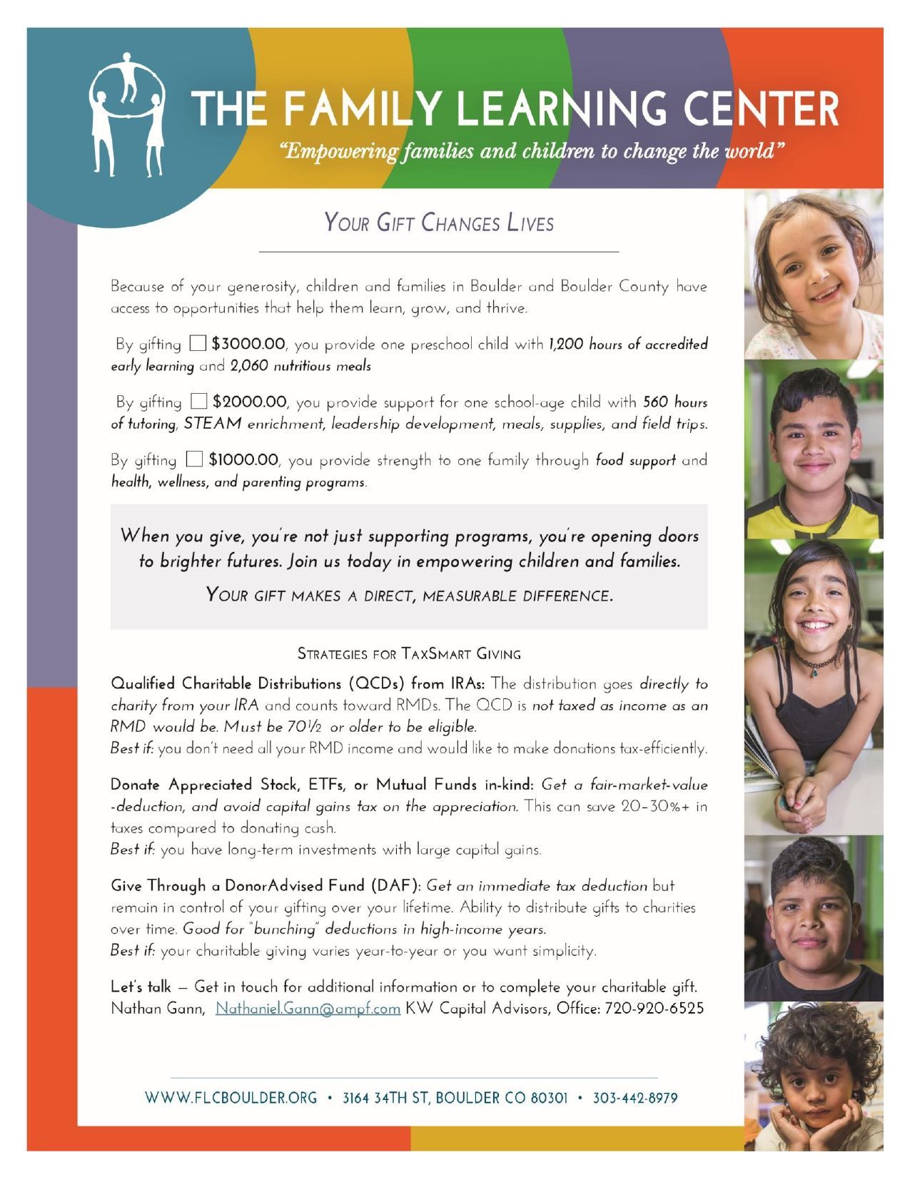 Your generosity transforms lives in Boulder and Boulder County by providing children and families with vital opportunities to learn, grow, and thrive. When you give, you're not just funding programs—you're creating pathways to brighter futures, making a direct, measurable difference in the community. Join us today at The Family Learning Center and empower those in need.